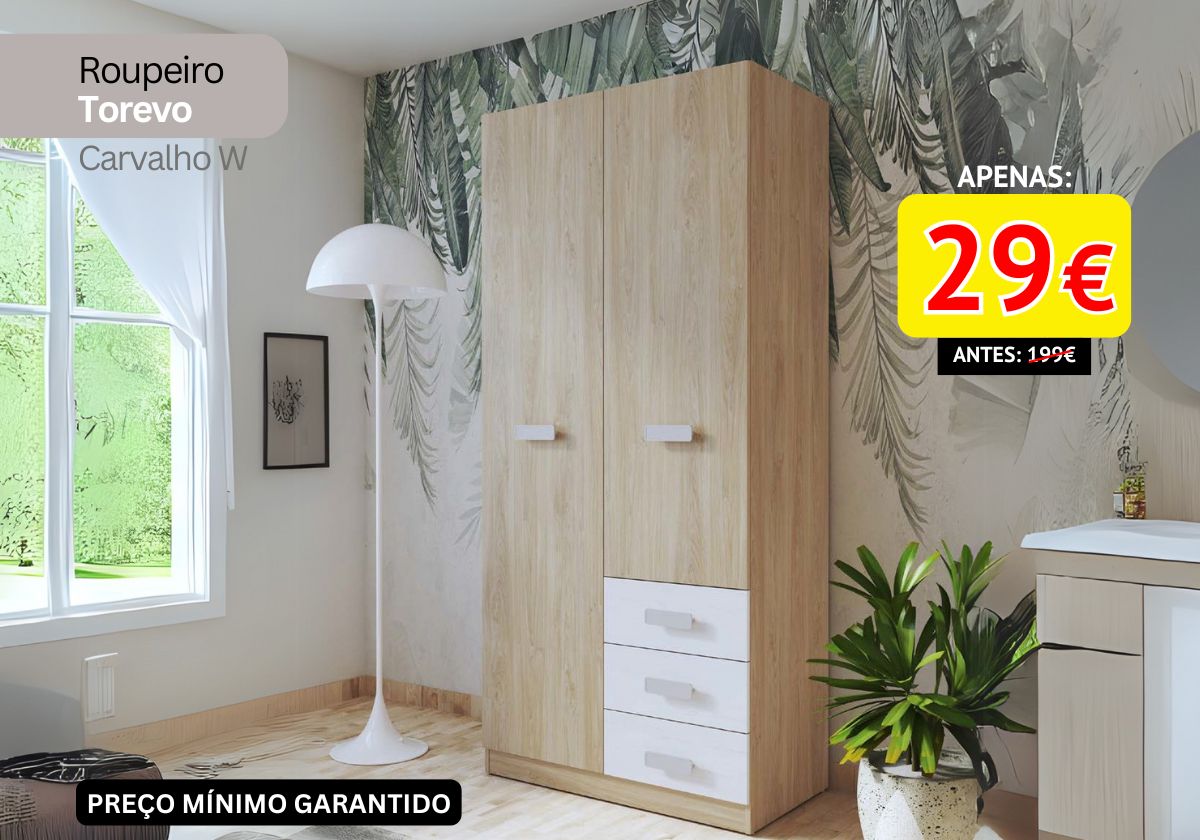 Para que o seu quarto transmita mais conforto é preciso que esteja organizado. Temos a solução: o Roupeiro Torevo inspirada no estilo nórdico, proporcionando um visual elegante e atemporal. Possui linhas direitas, neutras, pés de palito e puxadores finos e discretos. Poderá encontrar esta gama nos tons de carvalho e branco ou carvalho e preto.