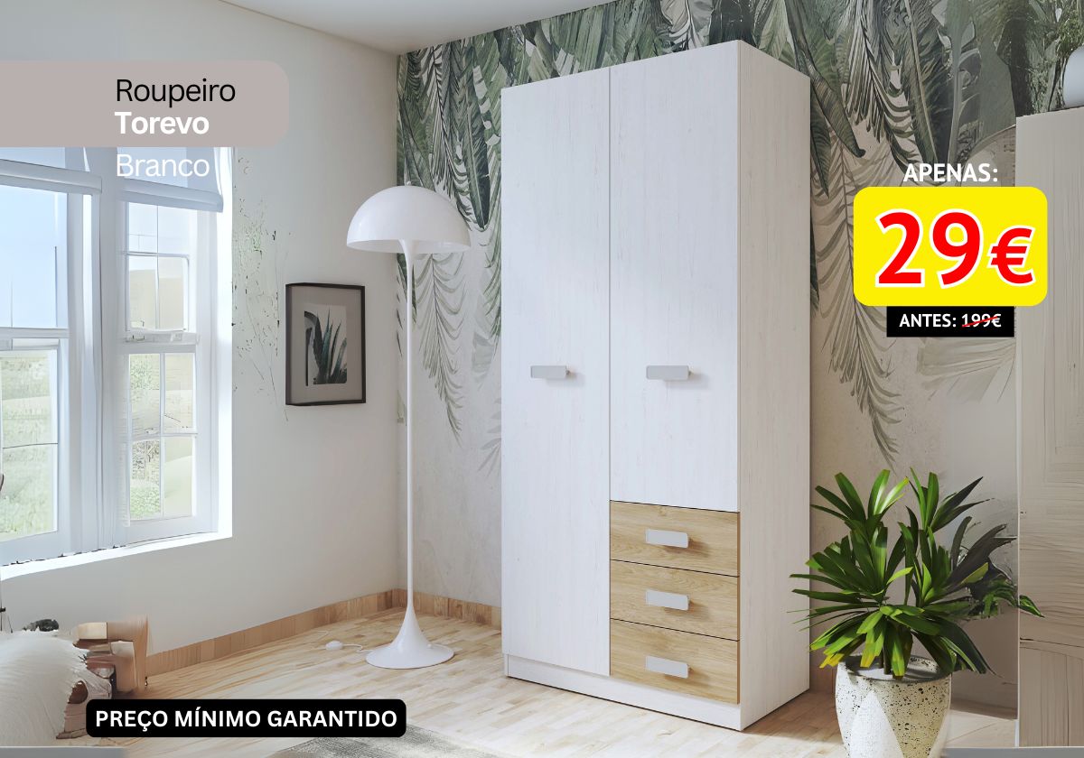 Para que o seu quarto transmita mais conforto é preciso que esteja organizado. Temos a solução: o Roupeiro Torevo inspirada no estilo nórdico, proporcionando um visual elegante e atemporal. Possui linhas direitas, neutras, pés de palito e puxadores finos e discretos. Poderá encontrar esta gama nos tons de carvalho e branco ou carvalho e preto.