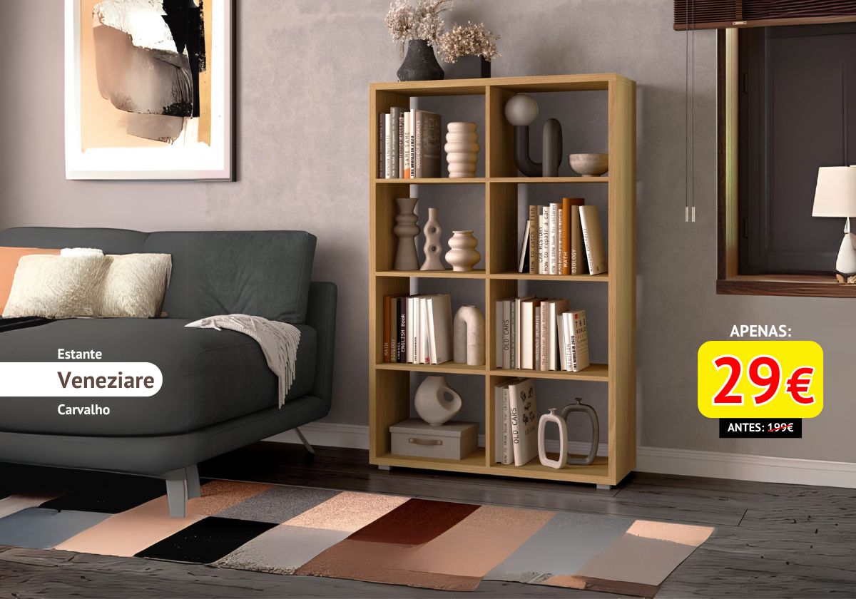 Uma Estante contemporânea. A Estante Veneziare é uma solução versátil e moderna para organização e decoração de qualquer espaço. Com um design elegante e funcional, esta estante oferece amplo espaço de arrumação, sendo ideal para livros, objetos de decoração, documentos e muito mais. Perfeita para a sala de estar, escritório ou quarto, a Veneziare destaca-se pelas suas linhas retas e estrutura simétrica.