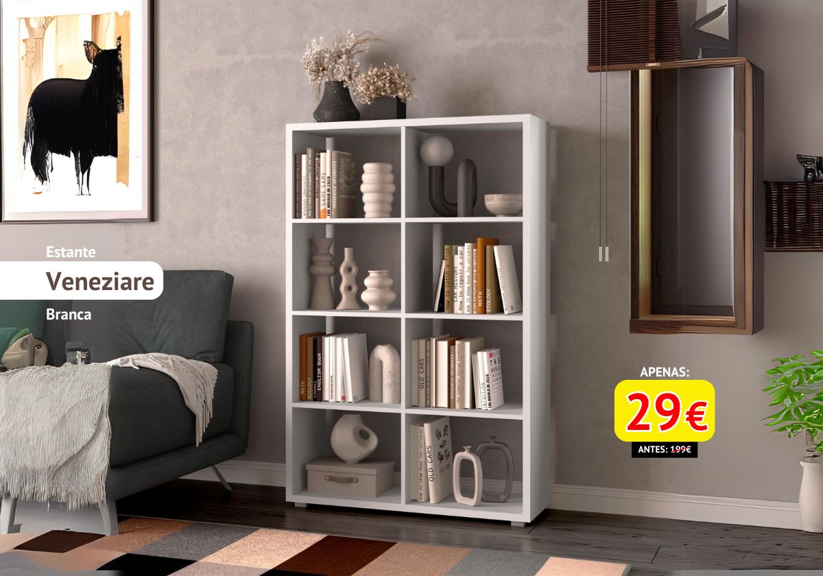 Uma Estante contemporânea. A Estante Veneziare é uma solução versátil e moderna para organização e decoração de qualquer espaço. Com um design elegante e funcional, esta estante oferece amplo espaço de arrumação, sendo ideal para livros, objetos de decoração, documentos e muito mais. Perfeita para a sala de estar, escritório ou quarto, a Veneziare destaca-se pelas suas linhas retas e estrutura simétrica.