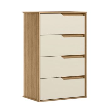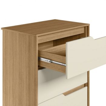 Pode ser integrada em diferentes estilos decorativos: possui um design moderno e simples, com estrutura em tom de carvalho e frentes de gavetas em cores neutras com atraentes puxadores embutidos, que são a imagem de marca da gama.