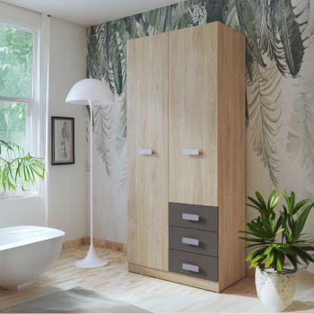 Roupeiro de cor Carvalho, com 2 portas e 3 Gavetas Castanhas.
