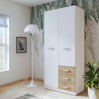 Roupeiro de cor branco, com 2 portas e 3 Gavetas Carvalho.